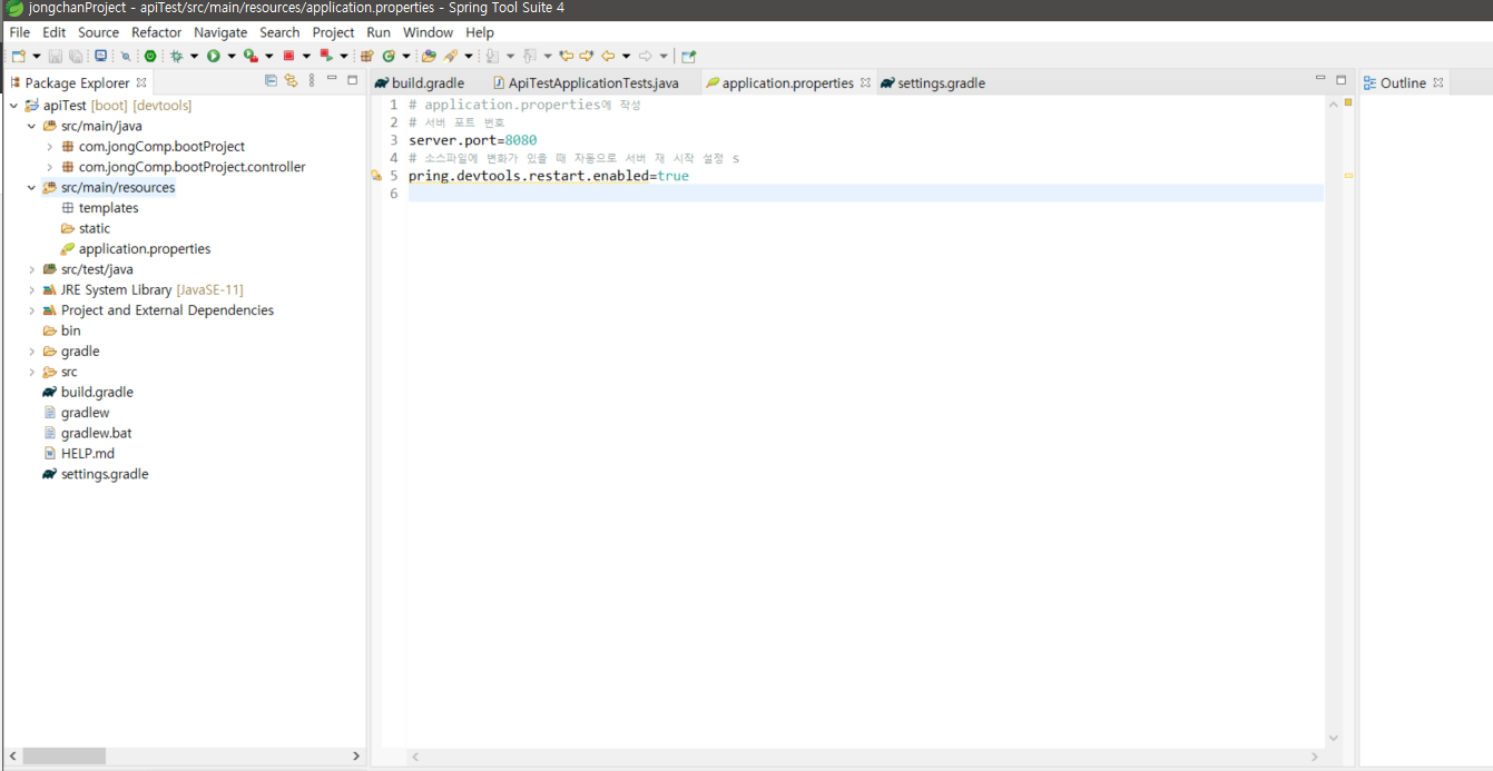 필자는 java버전을 11로 하였고 build.gradle의 환경을 위와같이 세팅하였다.